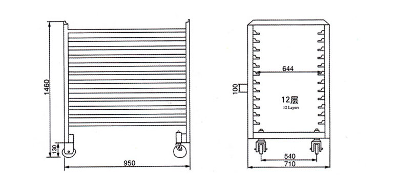 烘車規格:950×710×1510,每車12層,可置24只盤